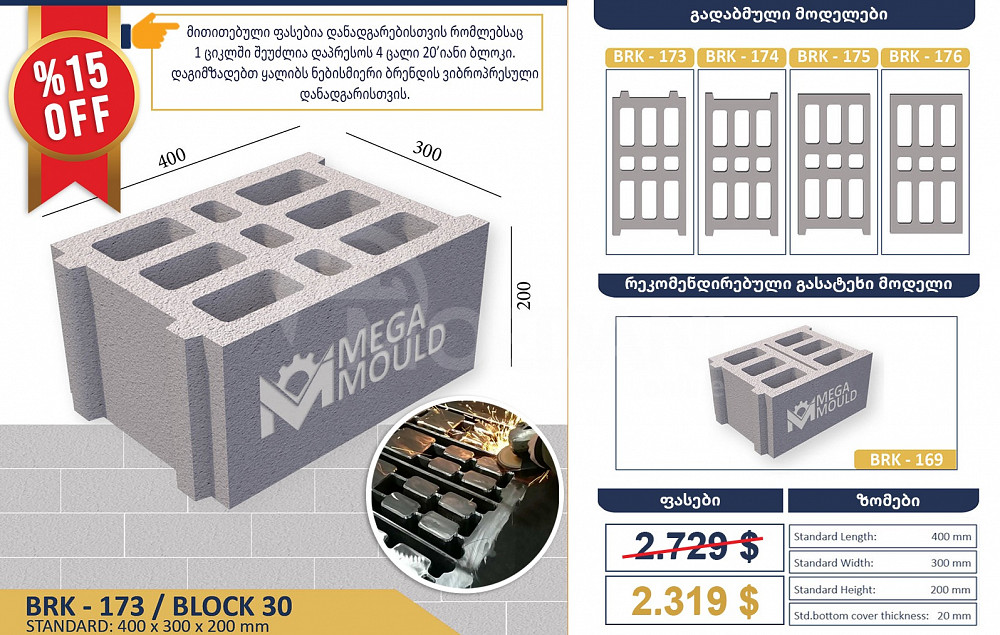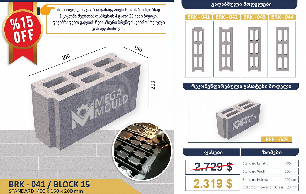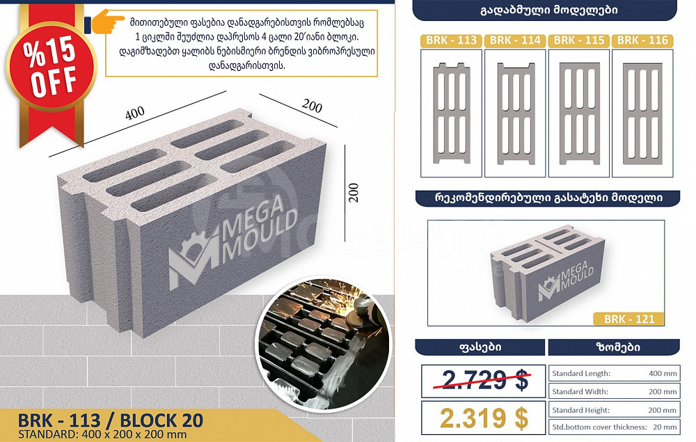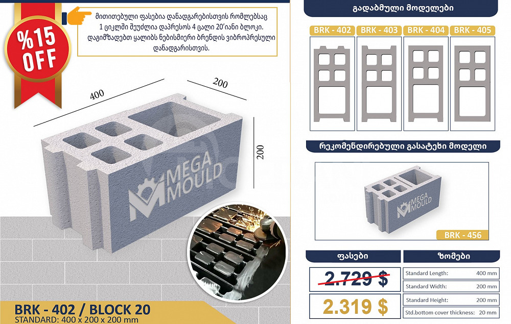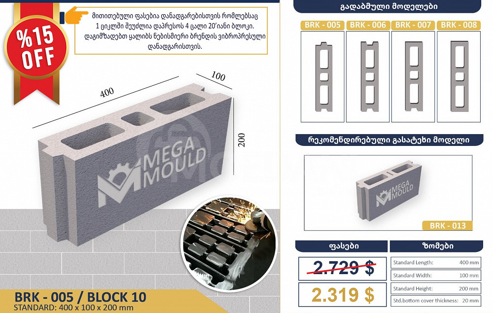 ერთ ციკლში 10 ცალი 20’იანი ბლოკის დამამზადებელი დანადგარებისთვის 4.968 USD