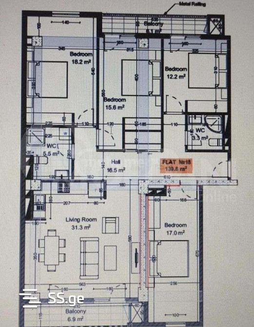 იყიდება 5 ოთახიანი ბინას 140მ² 6/18 სართ